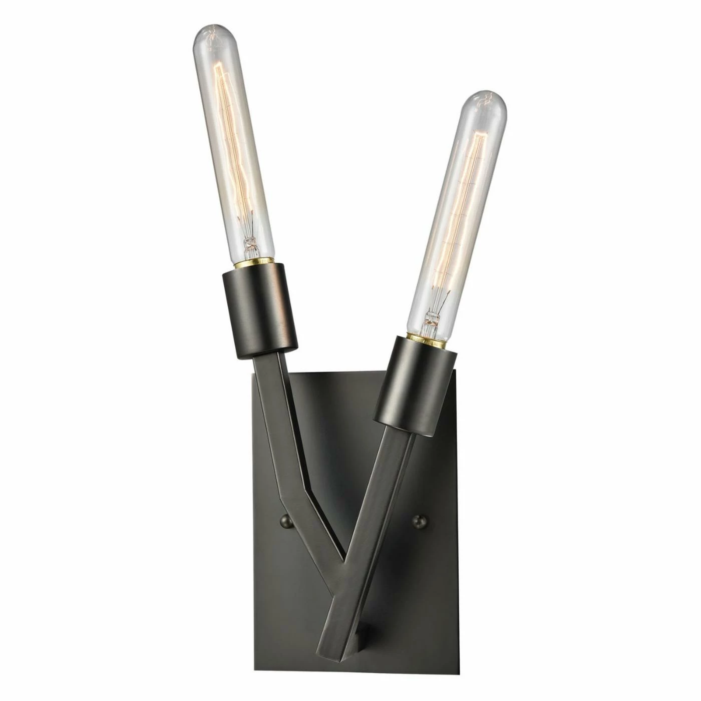 The industrial and artistic Elk Lighting Freeform 11852/2 Wall Sconce features two angled stalks in an aged black nickel finish. Each would perfectly support and showcase a slender, exposed filament bulb. This wall sconce requires two 60-watt bulbs (not included).