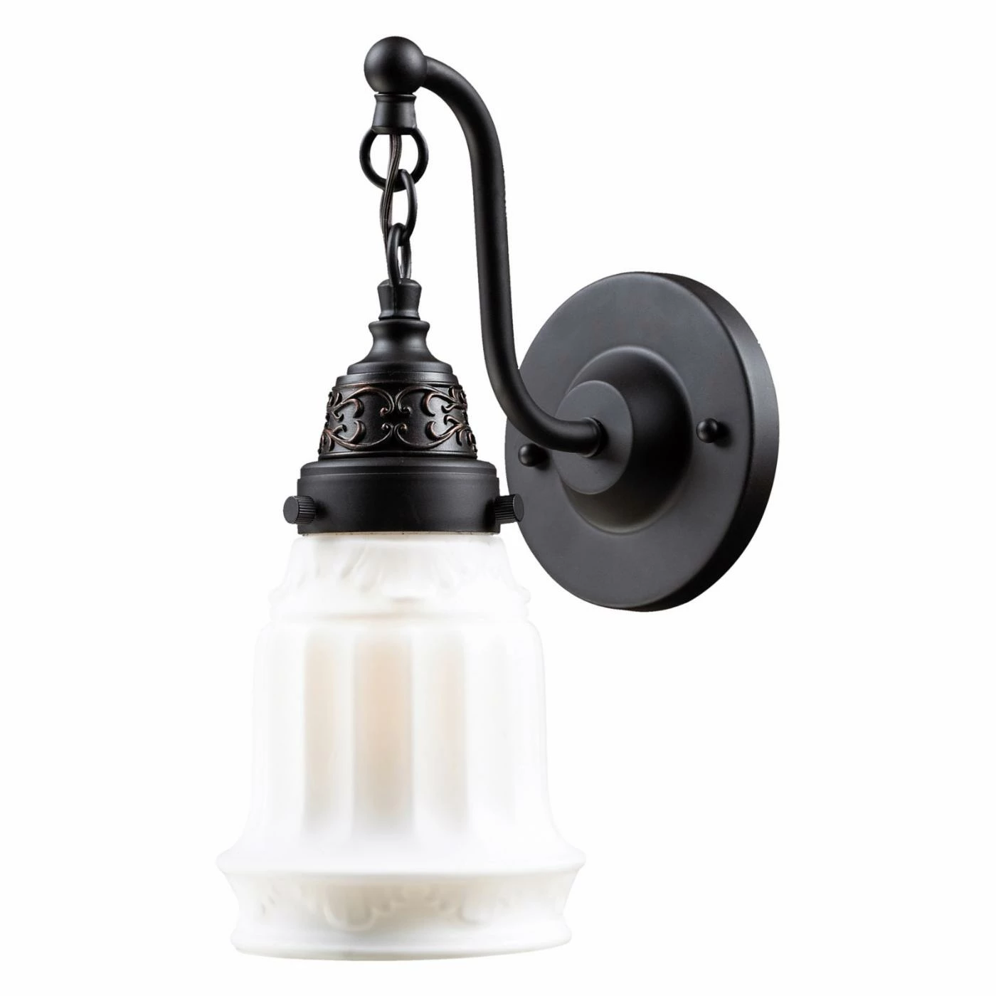 The ELK Lighting Quinton Parlor 66210-1 Sconce in Oiled Bronze provides a touch of vintage elegance to any setting. A gently curved arm holds aloft an embellished base and fluted white glass shade. Its single 60-watt bulb offers ample illumination and its transitional style blends perfectly with a variety of decor settings. Use this sconce to brighten up any hallway, entryway, foyer, or accent wall.