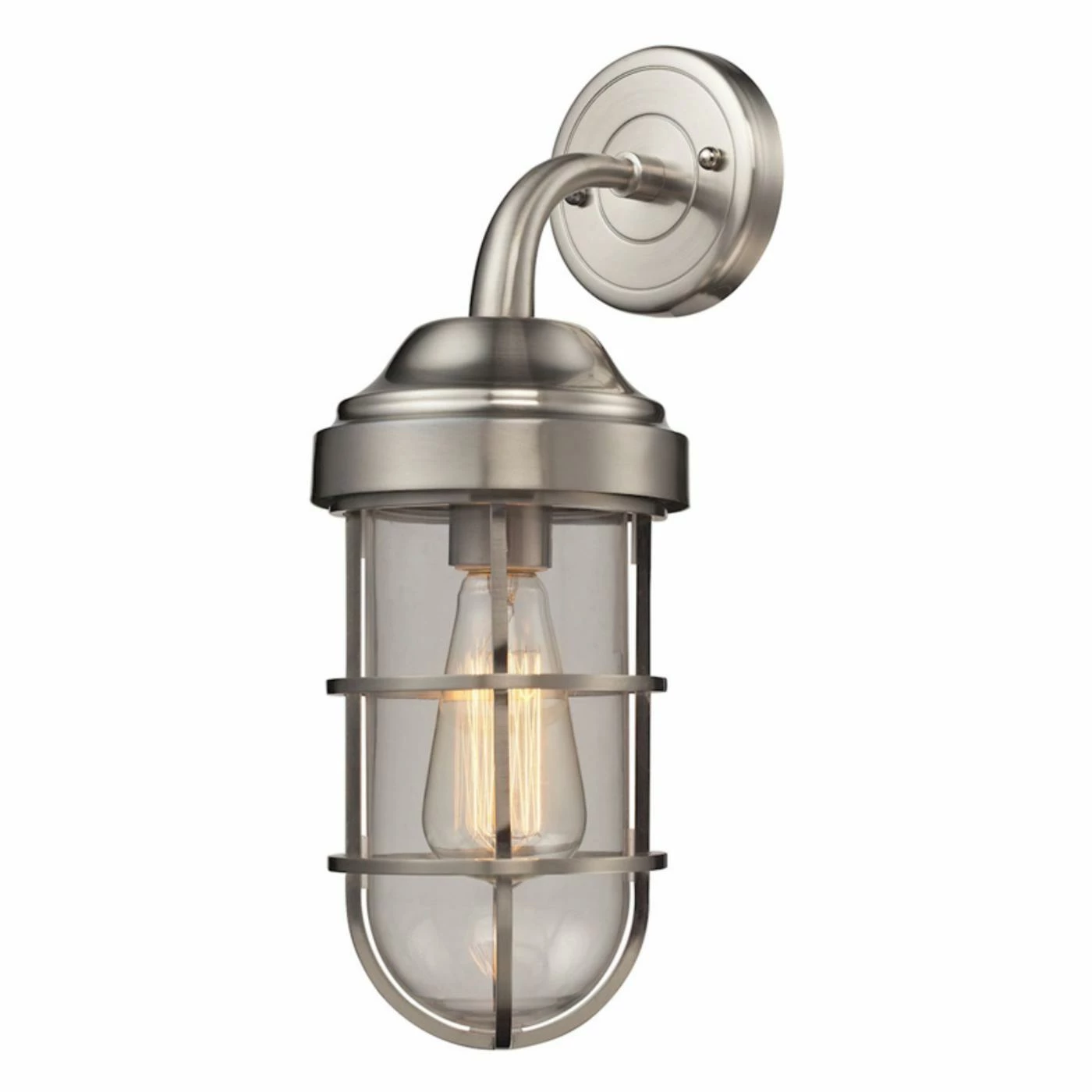 Drawing inspiration from harbor lighting, the Elk Lighting Seaport 663 Wall Sconce is perfect for illuminating coastal and industrial interiors. The downlight is visible inside a clear glass shade placed within a crosshatch steel cage. A simple round backplate completes the look.