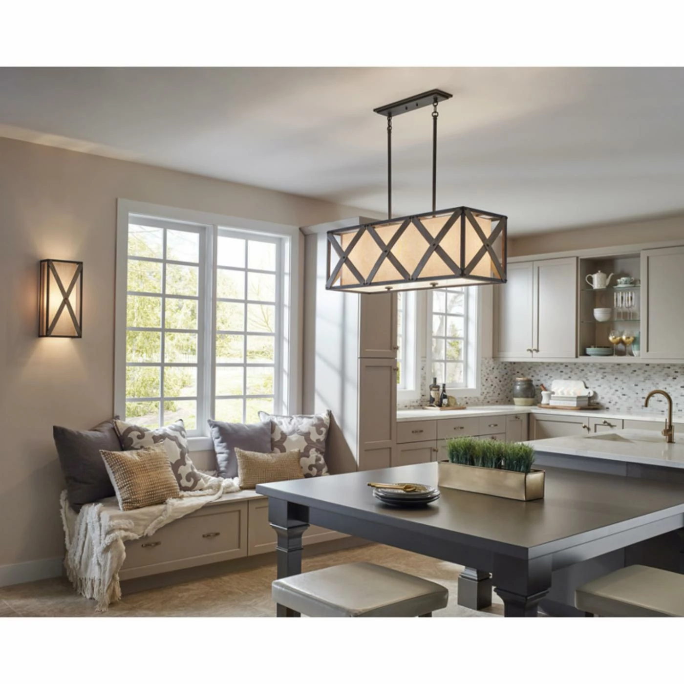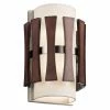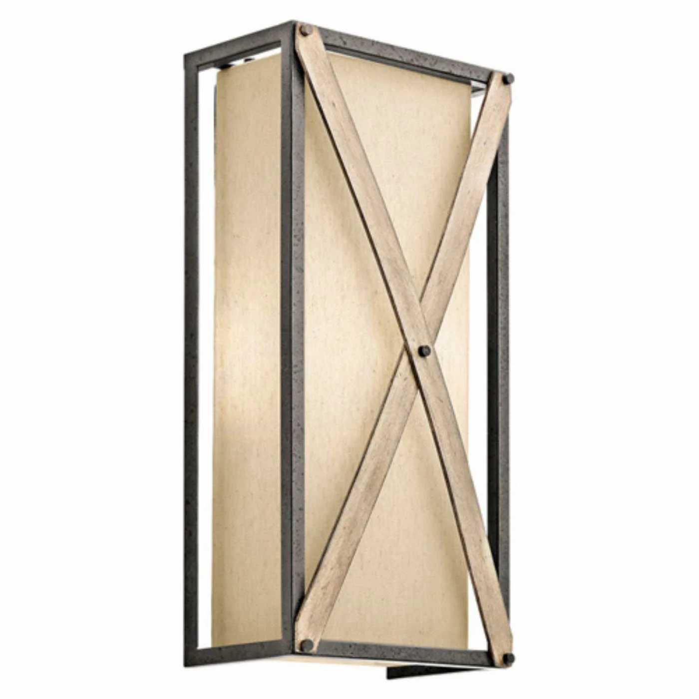 Distressed finishes and neutral beige fabric give the Kichler Cahoon 43777AVI Wall Sconce a warm, rustic look. Straight lines and architectural elements contrast with the interior fabric shade for a uniquely modern fixture that looks great in any space. This wall sconce requires two 60-watt incandescent bulbs (not included).