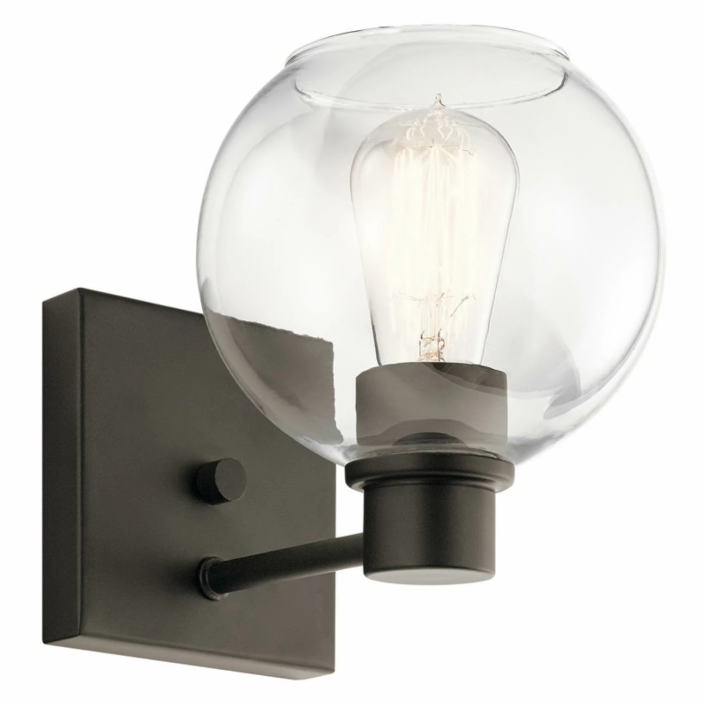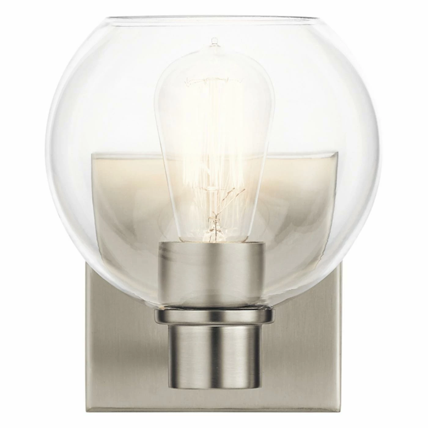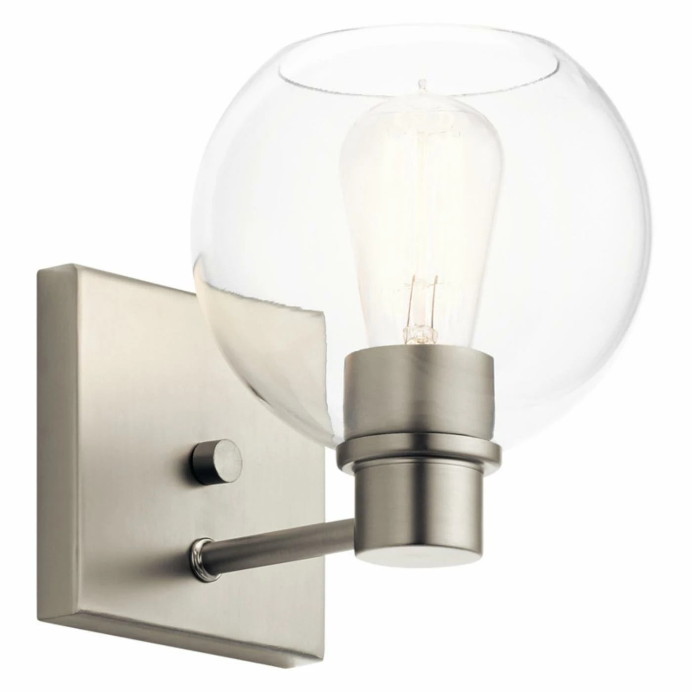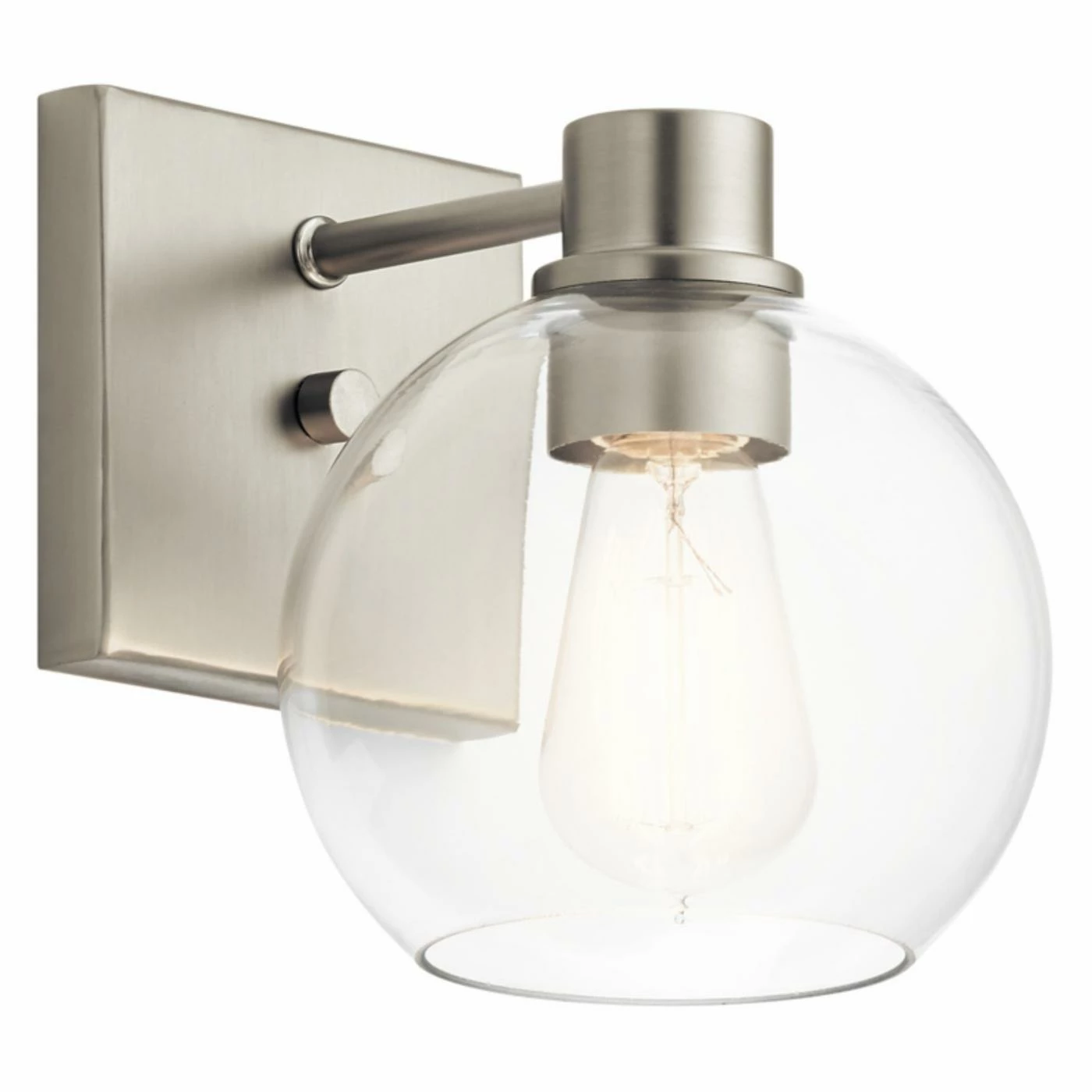 A round clear shade makes the Kichler Harmony 45892 Wall Sconce a bright addition to your bathroom. This single-light wall sconce features your choice of available finish options.