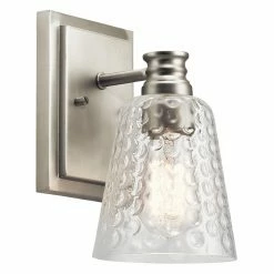 Put a playful finishing touch on the look of any room with the Kichler Nadine 45095 Wall Sconce. This single-lamp fixture pairs a sleek, polished nickel-finished stepped canopy and turned post with a whimsical thumbprint clear glass trumpet shade. Its mix of textures gives the sconce plenty of visual appeal. You can mount the wall sconce as an up light for ambient lighting or as a down light for accent or task lighting.