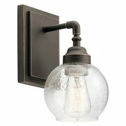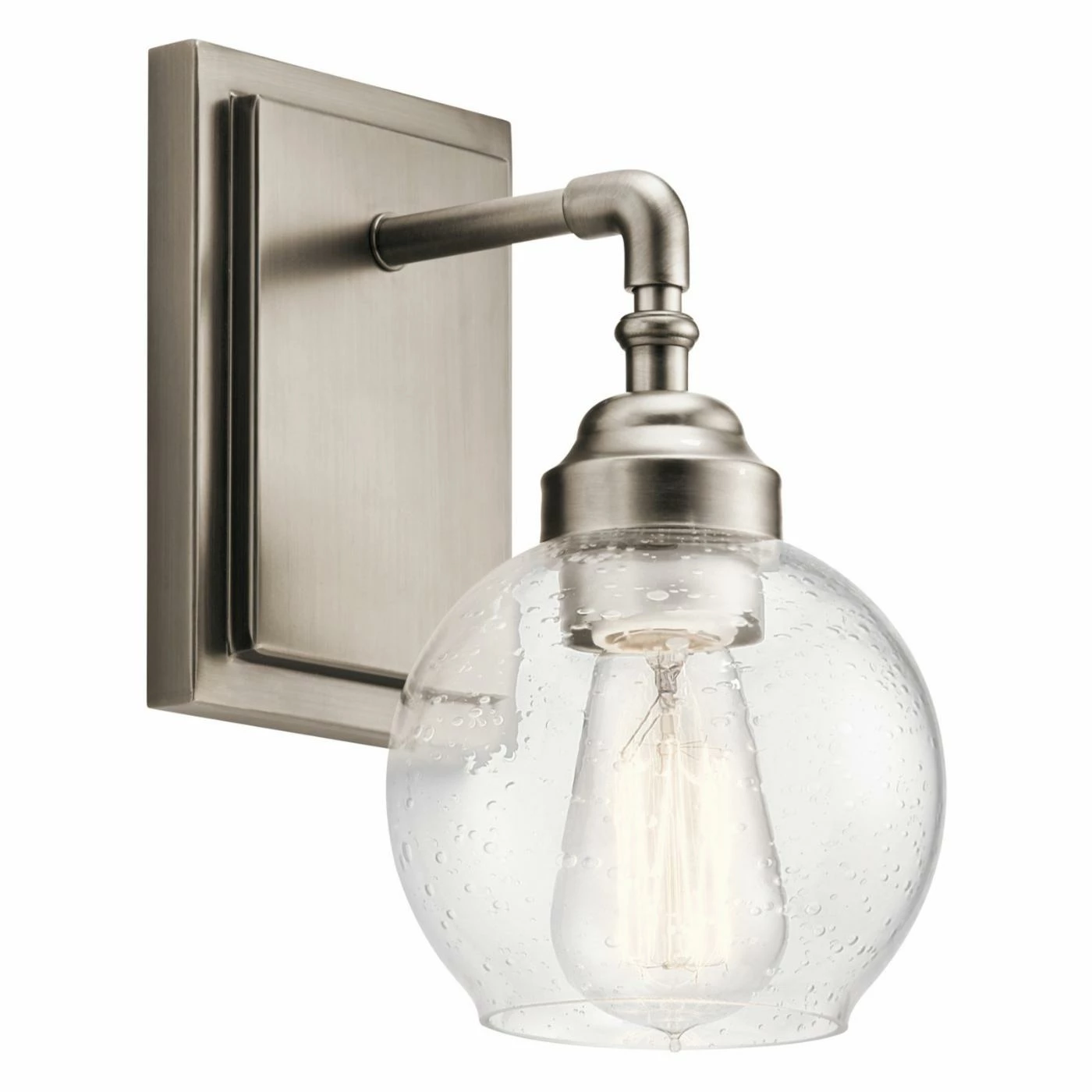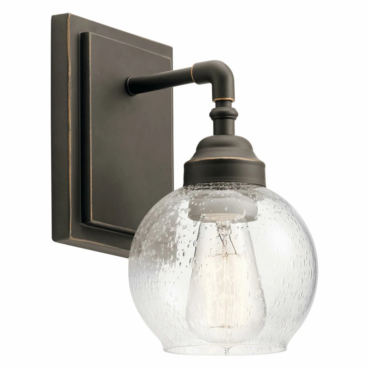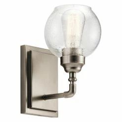 Brighten up your hallway or entryway with the Kichler Niles 45590 Wall Sconce. This wall fixture features a steel back plate and seeded glass globe for an industrial-chic look. It comes in select finishes to complement any dΓ©cor. It requires one 100-watt bulb (not included).