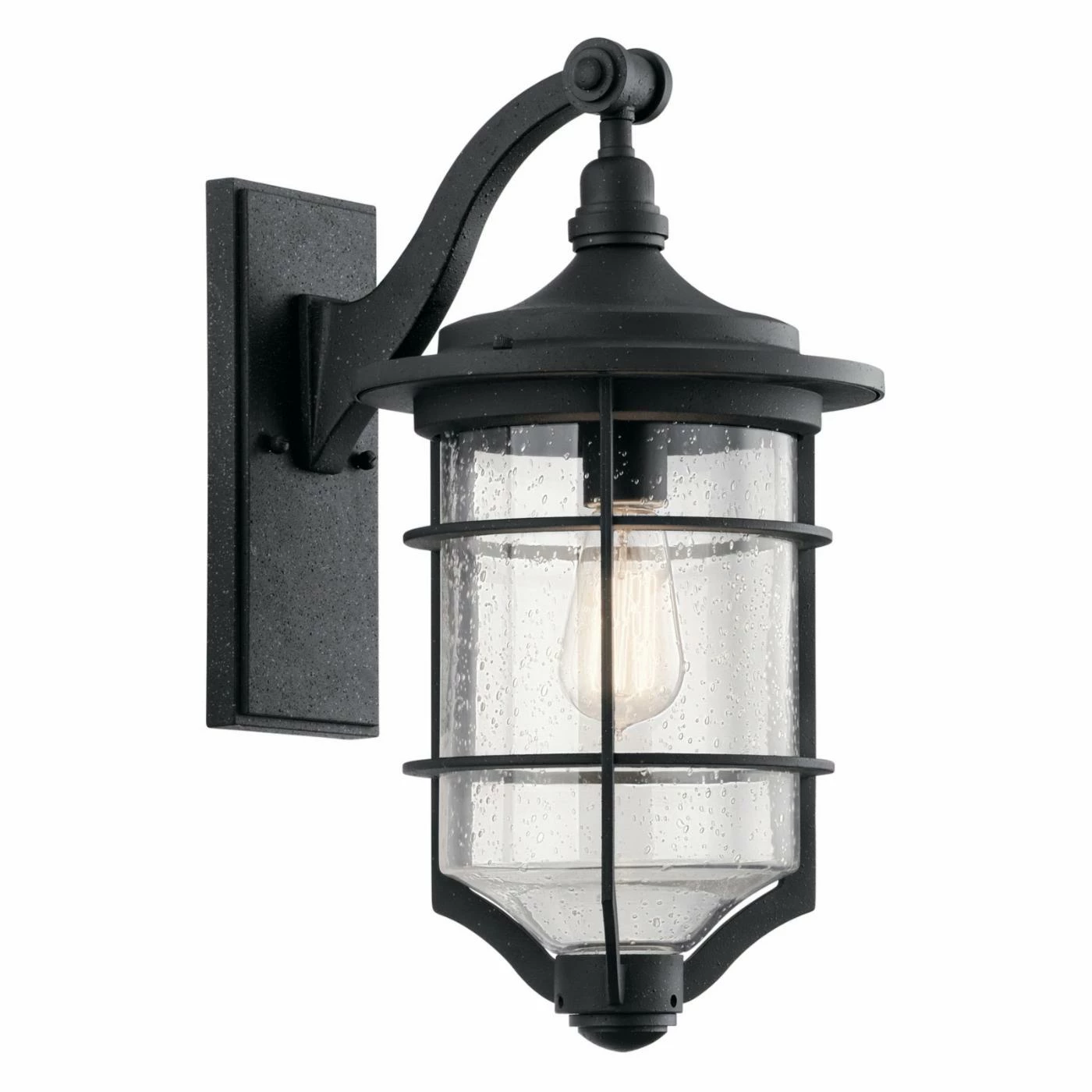 The Kichler Royal Marine 49127 Outdoor Wall Light adds a nautical element to your home’s exterior. The scalloped base and decorative cage are made from durable aluminum and finished in classic black. The seeded caged glass and Edison-style bulb (not included) create a vintage vibe.