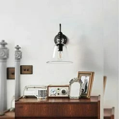 To properly showcase its filament bulb (included), the Warehouse of Tiffany Edison Mildred LD5008 Wall Sconce caps it with a graceful, clear glass bell shade. The curved mount of this wall sconce has an industrial black finish.