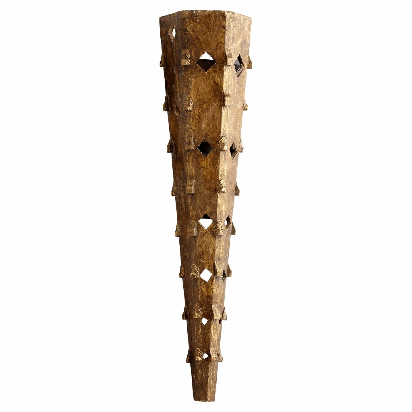 At three feet tall, the Cyan Design Aspire 06867 Wall Sconce is designed to get noticed. This grand wall sconce features a dramatically conical wood design with diamond-shaped perforations, raised details, and a mottled gold finish. This bold wall sconce requires one 60-watt incandescent bulb (not included).