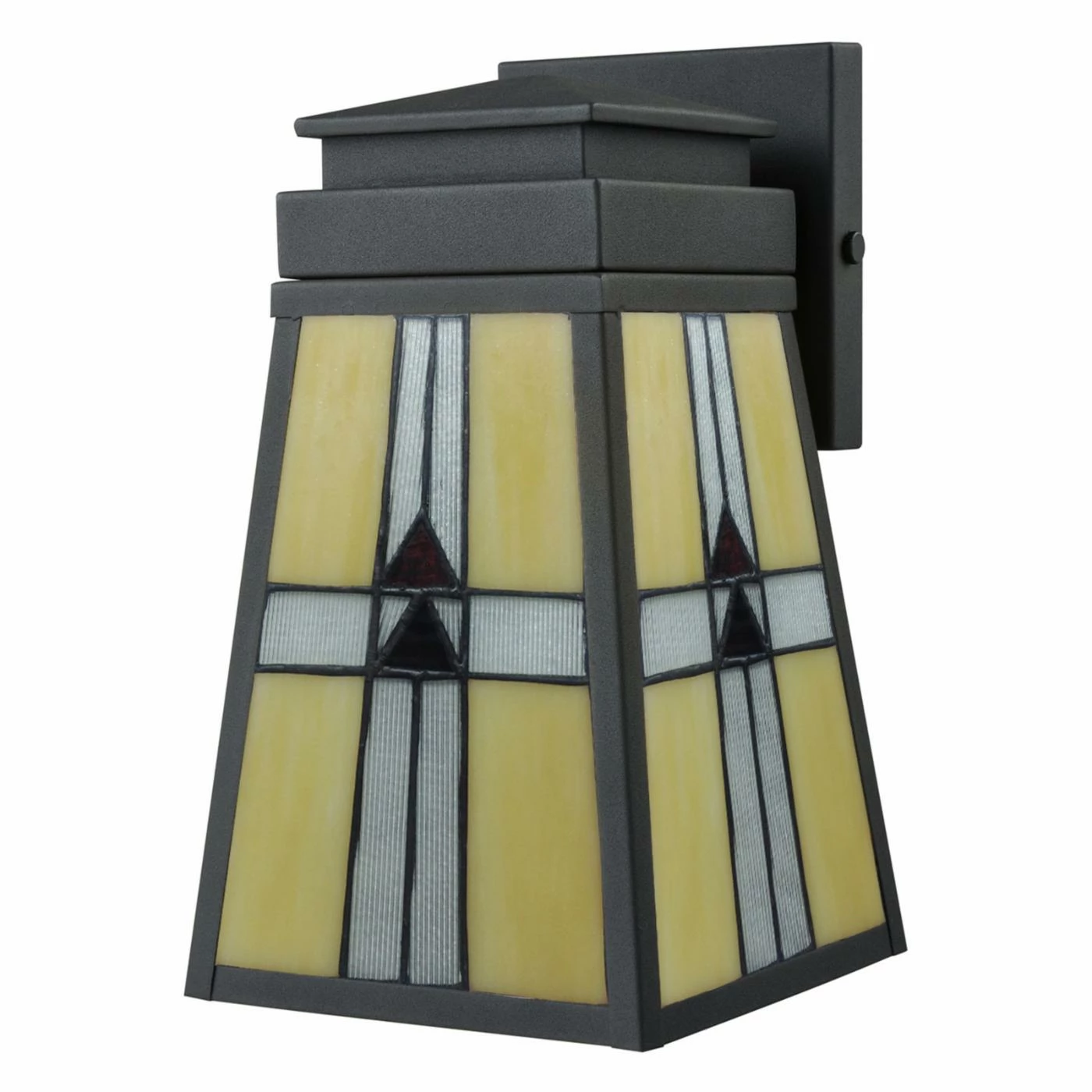Accentuate your home’s exterior with the Dale Tiffany Barkley STW16138 Tiffany Outdoor Wall Sconce. This wall sconce sports an elongated shade that gently flares at the bottom to disperse the light outward. The four glass panels feature golden amber insets, bisected by a cross design of frosted glass, outlined in black filigree. A pair of triangular glass jewels punctuate each pane to add a pop of color when illuminated. It hangs from the sturdy arm, which attaches to the square back plate. A sleek black finish lends the perfect final touch. It requires one 60-watt bulb (not included).
