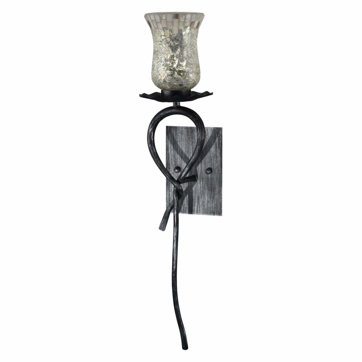Fill an empty wall space with the illuminating Dale Tiffany Hunters STW16129LED Mosaic Wall Sconce. This sconce features a lovely tulip shade with a base of shimmering gold crackle glass. Dual rows of art glass squares create a border around the flared top. A robust metal candelabra base holds the shade and is supported by the twisted rod and wall arm for a charming blend of rustic and modern aesthetics.