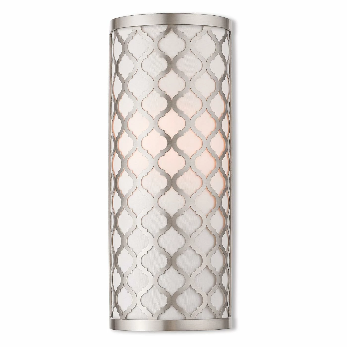 Add charm and warmth to your space with the Livex Lighting Arabesque 1-Light Wall Sconce. This wall sconce has an off-white fabric shade that mutes the beams from the bulb, and it has a steel exterior with a chic arabesque pattern. This fixture is a great choice for the foyer, hallway, or bathroom.