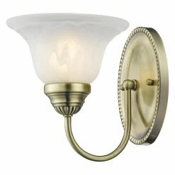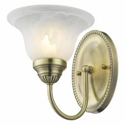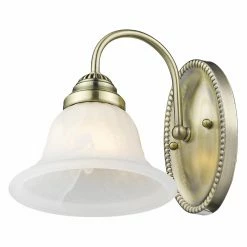 A lovely, traditional addition to any bathroom decor, the Livex Edgemont 1531-01 1-Light Bath Light in Antique Brass features a metal base with graceful, curved arm and antique brass finish. An alabaster white shade delivers gently diffused light from one 100-watt bulb (not included).