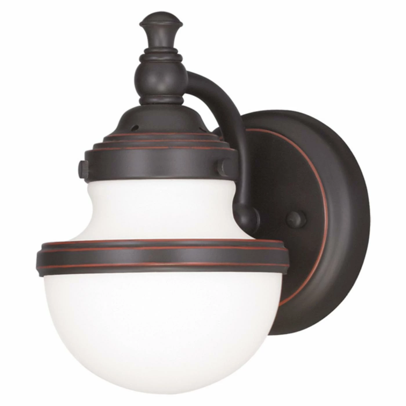 The old-world charm of the Livex Oldwick 5711 Wall Sconce is enhanced by a two-part shade of frosted glass that creates a warm, diffuse light that’s perfect for any part of the home. This damp-rated fixture features a metal body with a full range of finish options to fit your personal style. A single, 75-watt bulb creates the warm light that you’ll love to come home to.