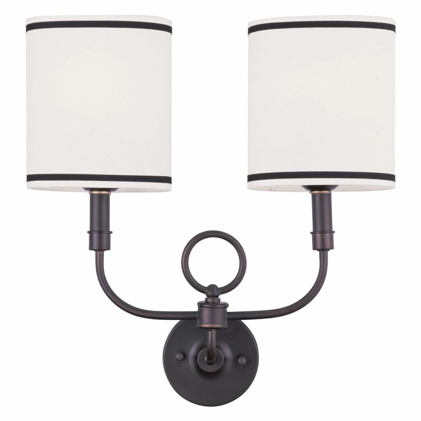 Dressing up the decor has never been easier – thank you, Livex 9122-07 2-Light Wall Sconce in Bronze. With an elegant transitional flair, this wall sconce features a bronze finish, industrial-style accents, and (best of all) two handmade off-white linen hardback shades – complete with black trim. Youโll need to add two 60-watt medium base bulbs to get glowing.