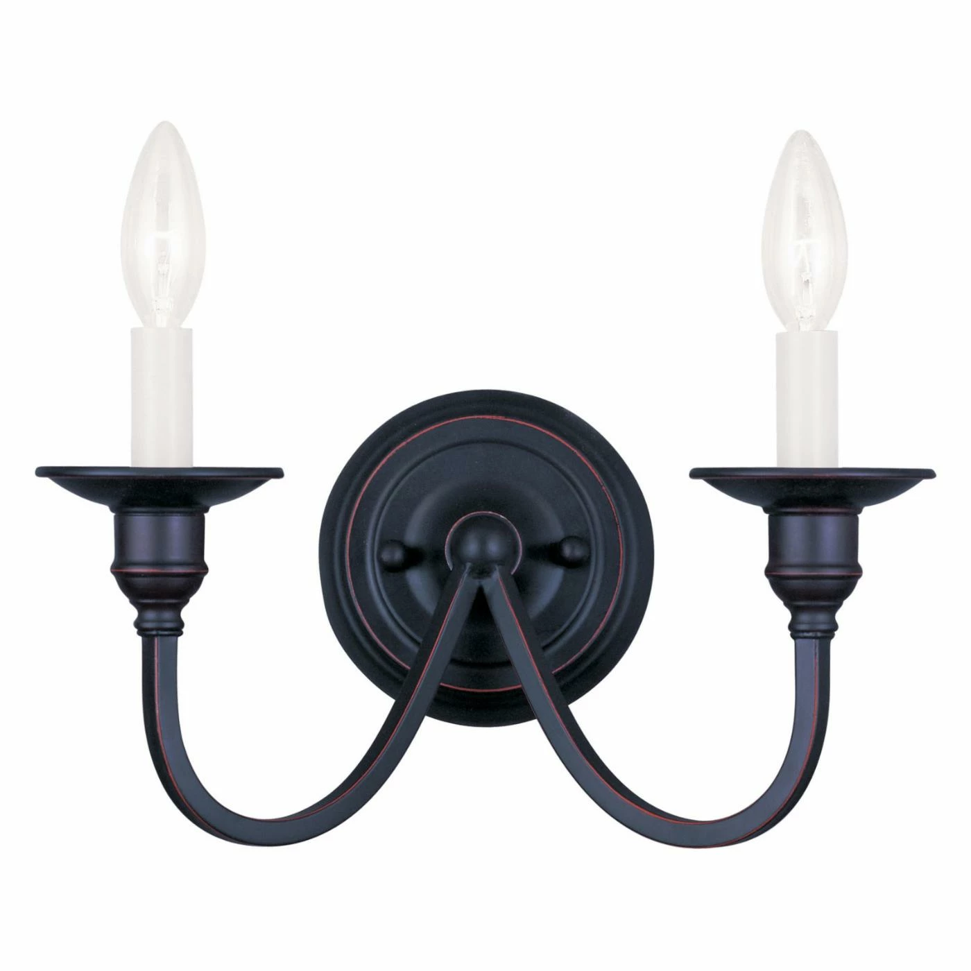 With smart charm and easy elegance, the Livex Cranford 5142-67 2-Light Wall Sconce in Olde Bronze is a new classic for your living space. The Olde Bronze finish features antique-inspired burnished edges, while the round backplate and molded details complete the design. The lights requires two 60-watt candelabra base bulbs (not included), and you can install the wall sconce indoors or out.