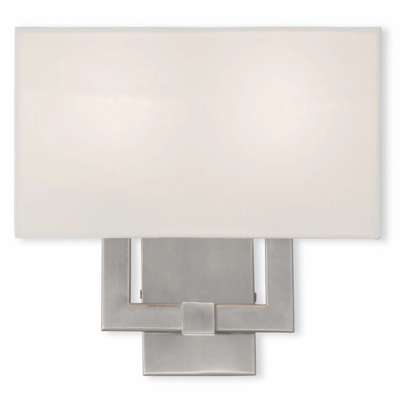 The Livex Hollborn 51103 Wall Sconce features a modern wallchiere design ideal within many settings. This wall sconce comes complete with a brushed nickel steel base and rectangular off-white fabric shade. Requires two 40-watt medium base bulbs (not included).