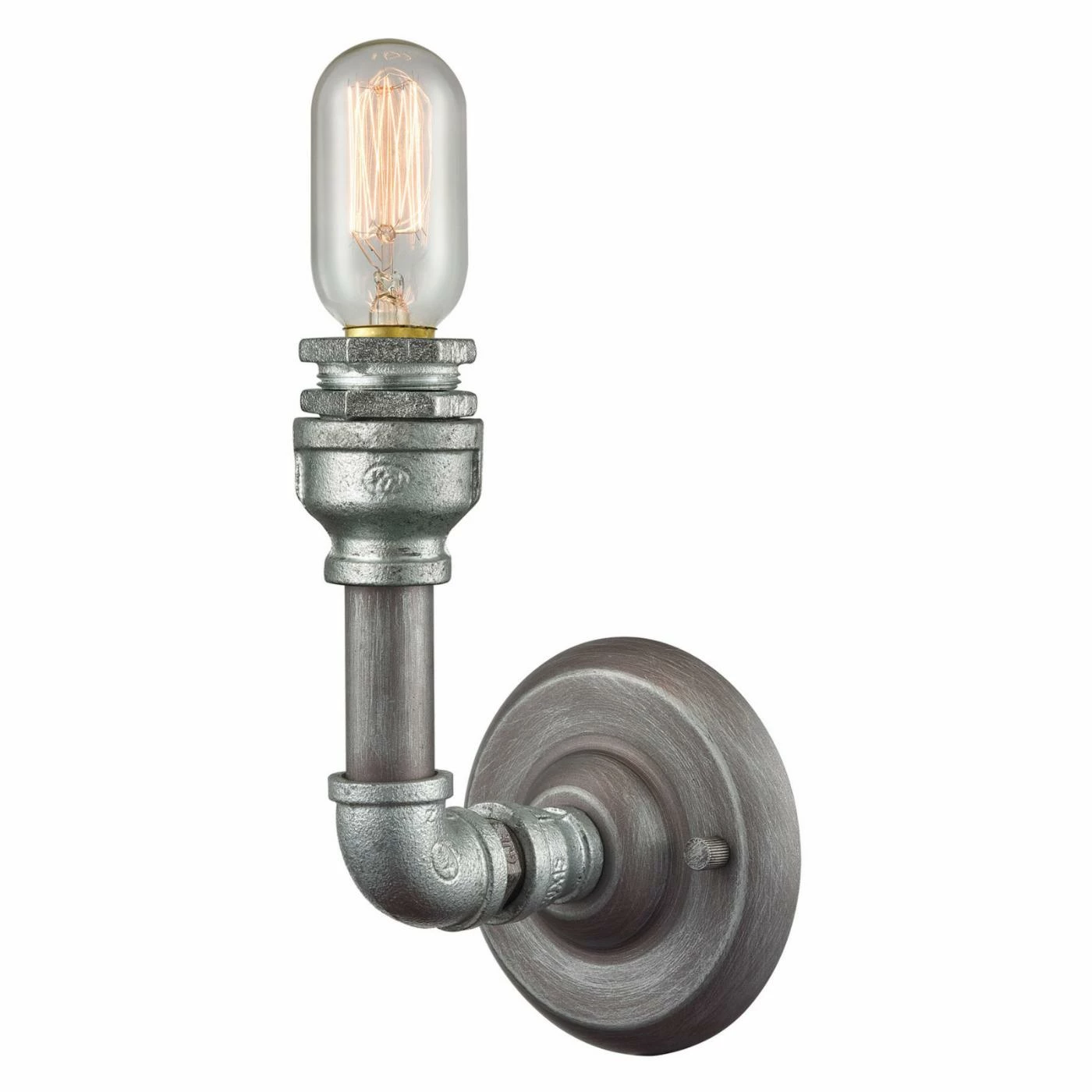 The ruggedly industrial Elk Lighting Cast Iron Pipe 10682 1 Wall Sconce has the look of pipe and joinery in two-toned weathered zinc and zinc plating finish. This wall sconce is a perfect way to showcase Edison style bulbs. It requires one 60-watt bulb (not included).