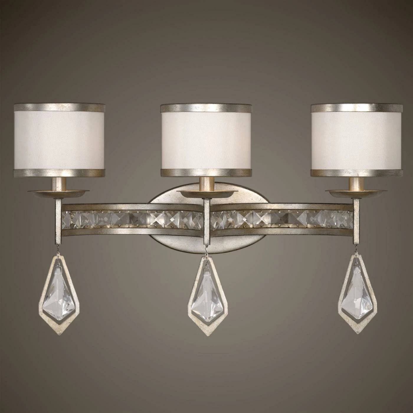 Light up the sink in glamorous style with the Uttermost Tamworth Modern 3 Light Vanity Strip. This transitional wall light features clear crystal drops and trim that glisten under the three uplights. A burnished silver champagne leafed finish on the metal frame and backplate enhance the elegance of the design. To soften the glow of the lamps, each light is covered by a silky off-white hardback shade.